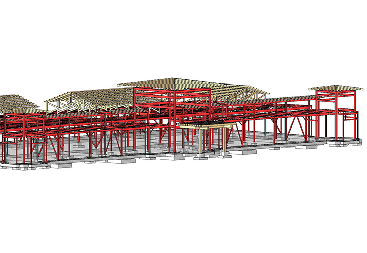 Open web steel joist on structural steel beams and columns designed to support roof mounted mechanical equipment. Lateral bracing is comprised of a combination of interior and perimeter knee-braced frames and K-braced frames. Clerestory element near the front of the facility, each side of main entry, required the use of custom horizontal rod bracing to transfer diaphragm forces to the braced frames. Conventional metal-plate connected wood trusses were used to form the hip roofs at the entry and corner towers, as well as the clerestory roof. Custom, exposed heavy timber trusses were utilized at the high volume areas. Custom timber framed canopy at the front entry. Exterior, non-load bearing light gage steel wall framing designed to support the finishes and openings. Conventional slab on grade foundation with isolated spread footings at columns.