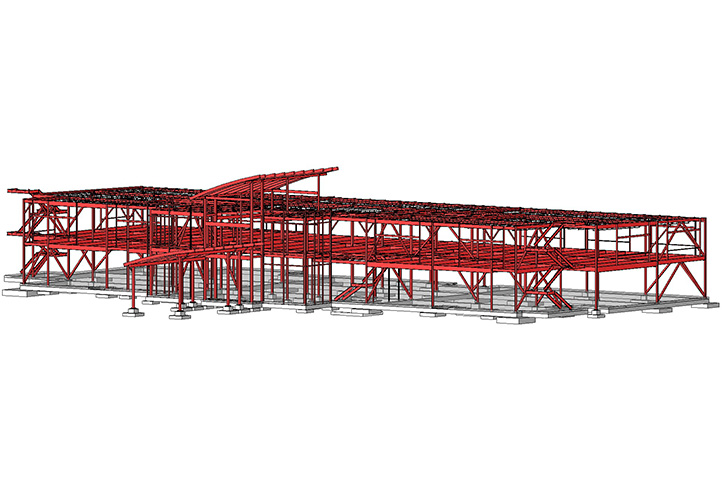 A steel framed structure with composite floor slabs was designed to provide support for this medical office building. Interior and perimeter steel braced frames paired with exterior concrete masonry shear walls function as the lateral load resisting system. The architectural scheme incorporated a clerestory glass wall with curved steel roof over the vestibule with a matching curved steel roof over the porte cochere. Exterior, non-load bearing light gage steel wall framing designed to support the finishes and openings along with structural steel to support sunscreen canopies at windows. Conventional slab on grade foundation with large, shallow spread footings to support the two-story structure.