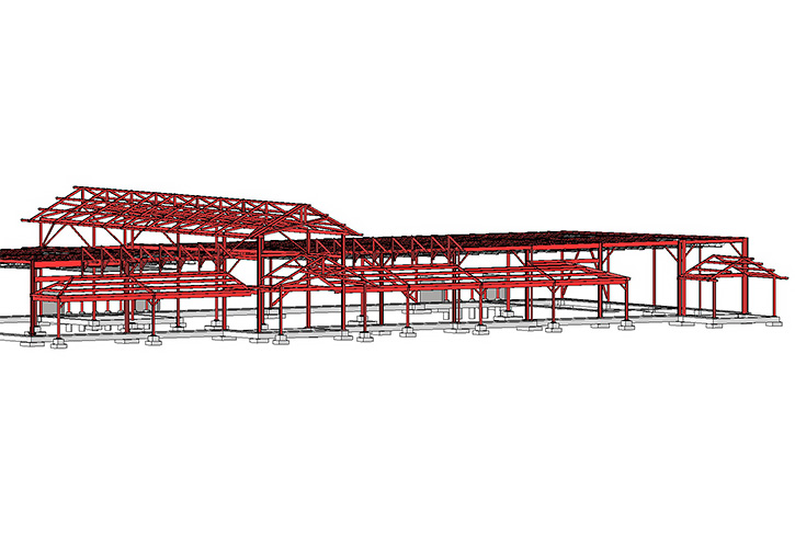 Open web steel joist on structural steel beams and columns designed to support roof mounted mechanical equipment. Lateral bracing is comprised of interior and perimeter knee-braced frames. Clerestory element spans full depth of the facility with exposed, custom structural steel trusses. Custom structural steel canopy forms the covered walk across the front. Wood framed mezzanine supports the office space. Exterior, non-load bearing light gage steel wall framing designed to support the finishes and openings. Conventional slab on grade foundation with isolated spread footings at columns.